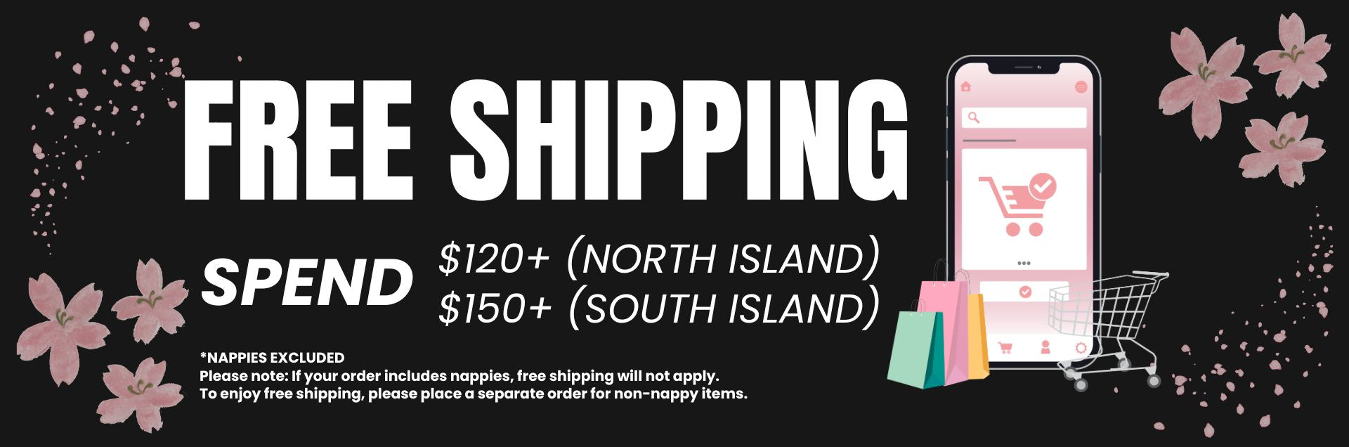 When you spend over $120 (North Island) - $150 (South Island) | *Nappies excluded | Please note: If your order includes nappies, free shipping will not apply.To enjoy free shipping, please place a separate order for non-nappy items.